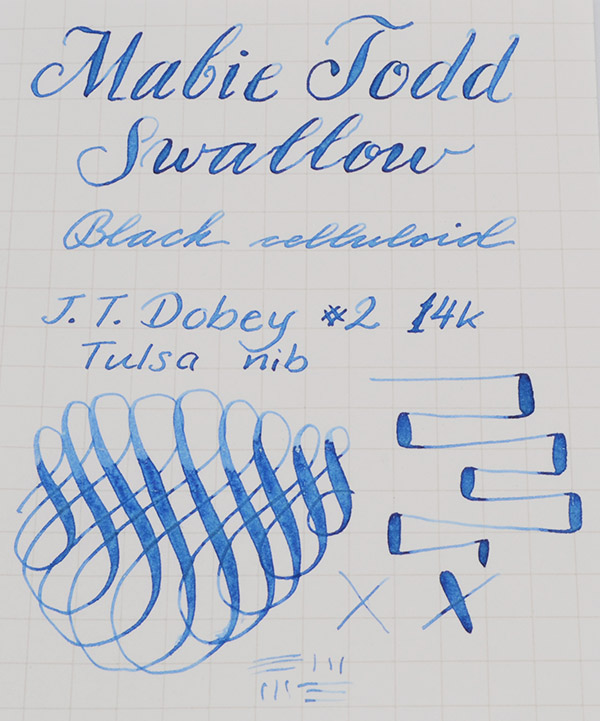 Nib FINE flexible nib marked "J. T. Dobey #2 14k Tulsa". It puts down a fine line, and has really nice flex from extra fine to broad. Please see the writing sample below.