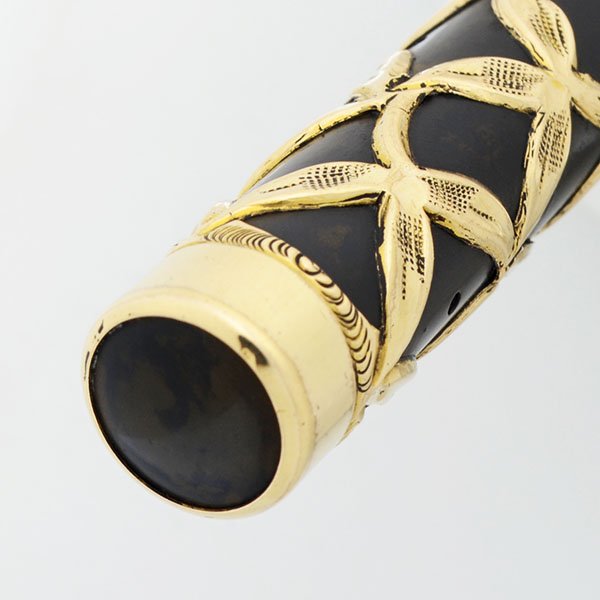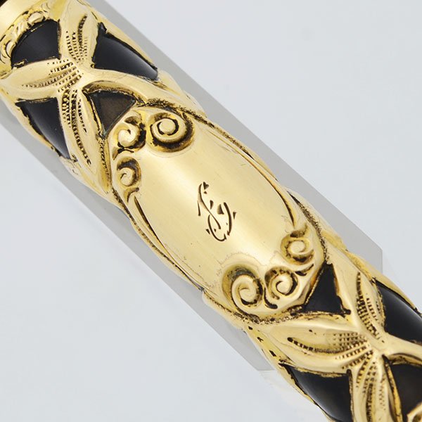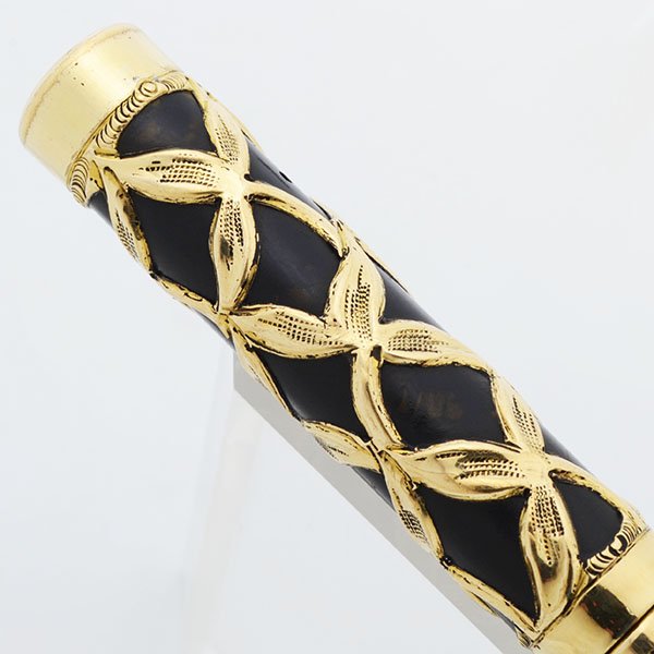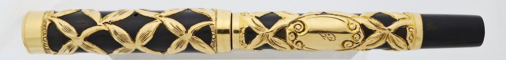 Condition Excellent condition. This is an ornate and elegant pen in a classic vintage design. Very thick overlay, with some brassing on the edges. The black hard rubber was re-blackened (not by us) has some scratches that show the original hard rubber color. The gold filigree is a very pretty floral design. It has some scratches. The gold top of the cap has a little ding where it meets the top of the cap. There is a fancy etched initial (F?) mid-barrel. There are no imprints on the pen itself.
