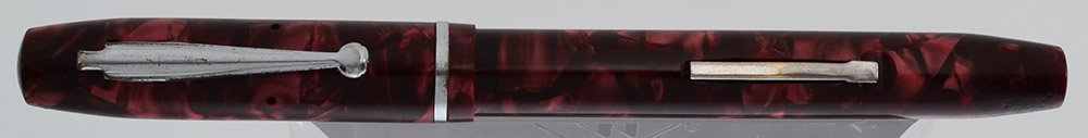 Color Marbled red celluloid with white gold plated trim. We think it's white gold because it doesn't have the pitting nickel plating gets but it does have brassing. Around this time period, white gold was occasionally used for trim so it seems like the correct precious metal used.