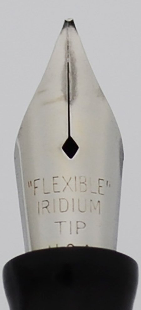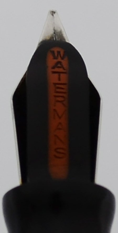 Nib FINE steel nib labeled, "Flexible." It does not offer much more than semi-flex and is more springy than anything. The tines curve up a bit to create the point. It has a red and black Waterman ebonite feed.