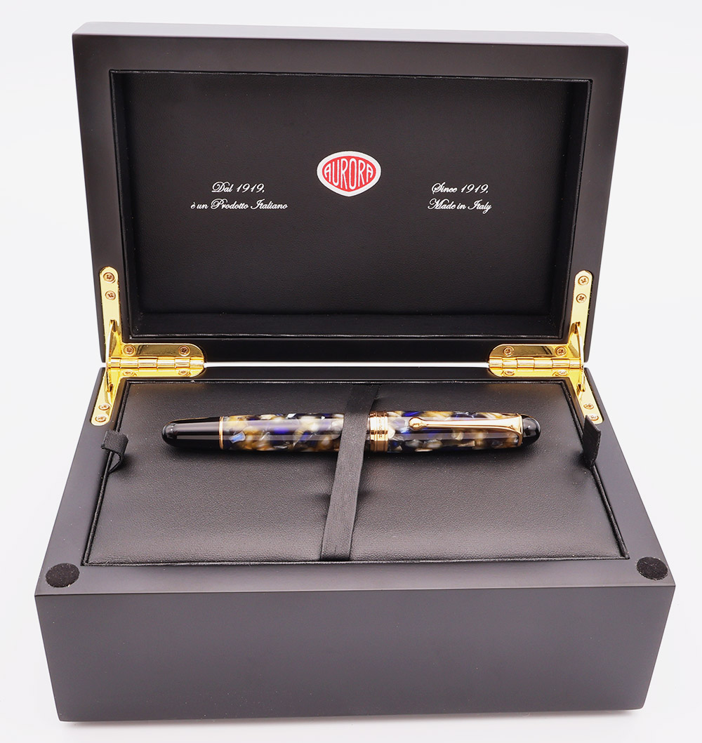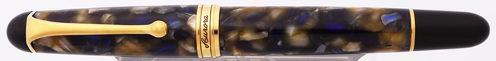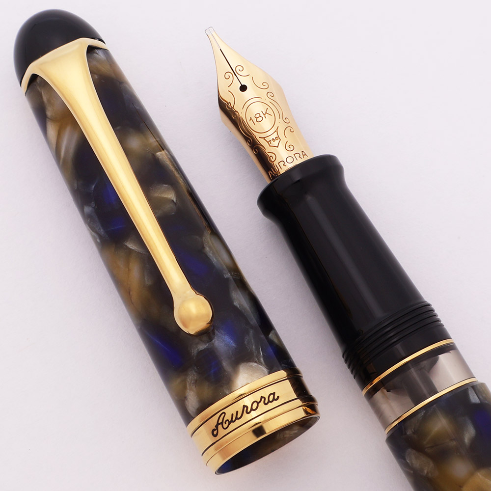 Color "Blue Nacre Auroloide" - Auroloide is Aurora's name for their cellulose acetate, and the colors here are blues and warm pearly golds. Gold plated trim.