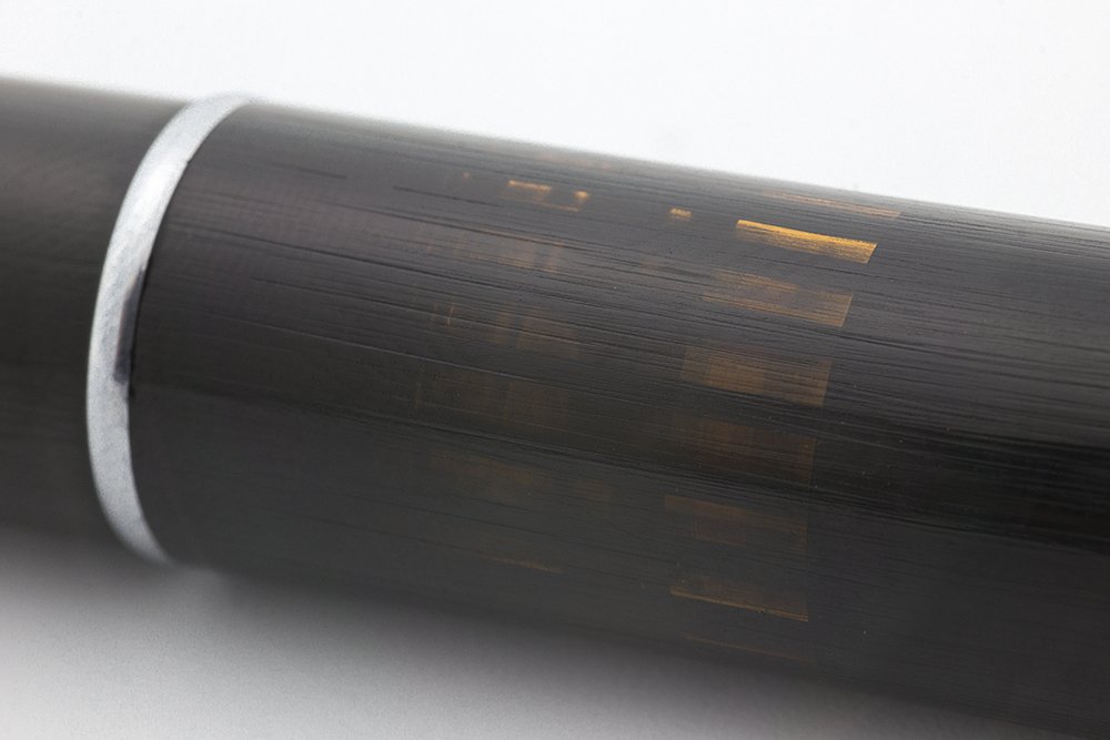 Color Black with satin finished gold plated cap and usable ink window. The black barrel and section are textured ala the Lamy 2000.