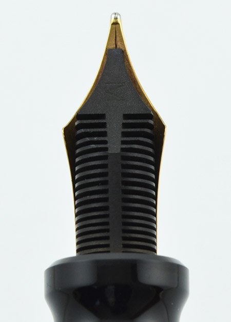 Nib 18k Medium nib. The feed is labeled, "M." The nib is smooth with lots of tipping material for a soft writing experience.