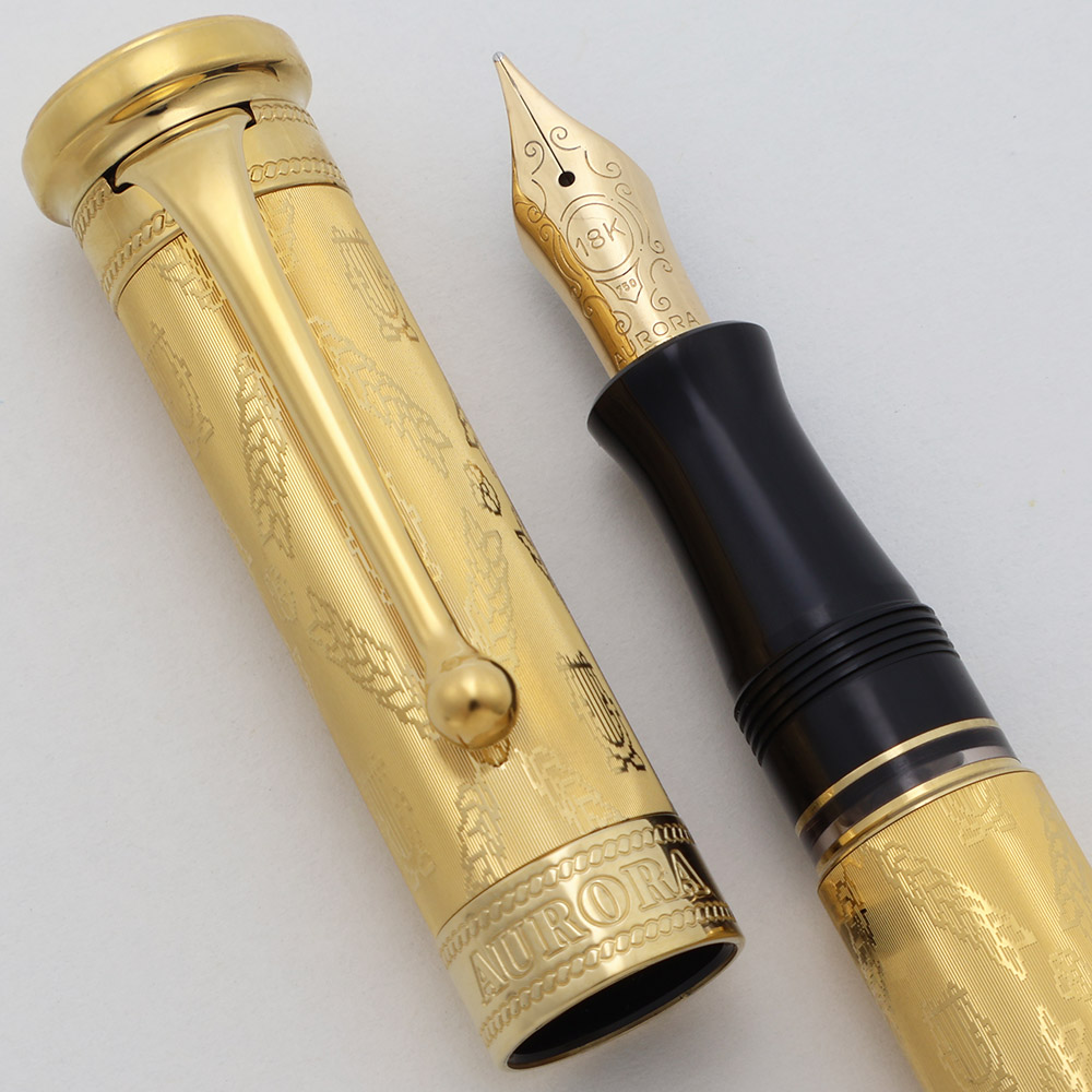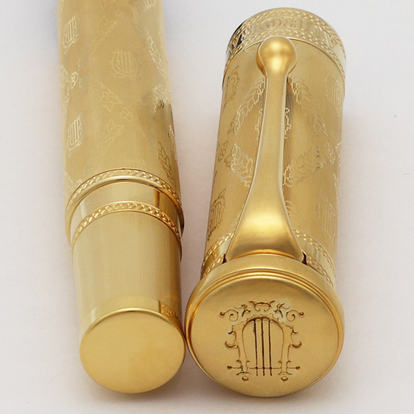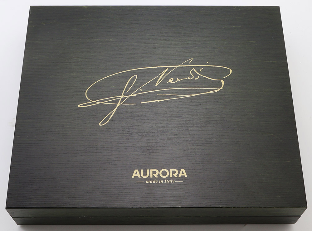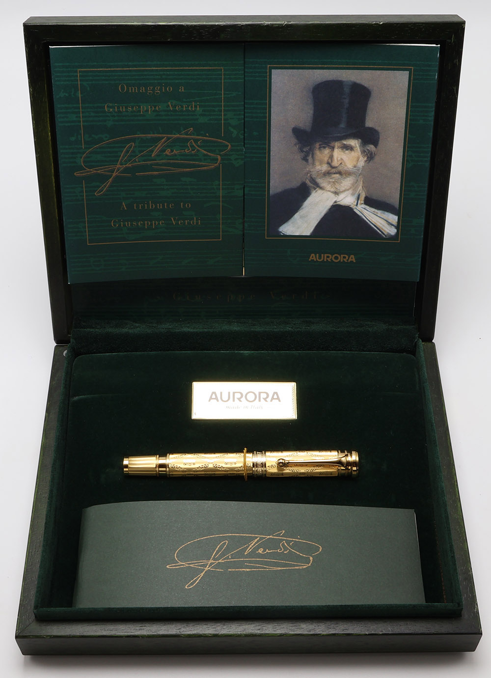 Condition Excellent + condition, in box with paperwork. The barrel and section have microscratching, but are largely smooth with no noticeable individual scratches. The cap and trim look fantastic, with mostly just light polishing marks. There is a ring of very light scratching on the plain band near the end of the barrel, where the cap has been posted a few times. The pen has had ink in it, but we really only see light signs of usage. The imprints are clear. Ships in wooden box with outer cardboard sleeve and paperwork. There is also an accompanying CD in the box with selections from Verdi's most famous works.