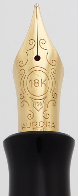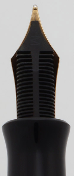 Nib MEDIUM 18k nib. The back of the feed is marked with an M. There is a visible scratch on the nib, just above the "18K" mark, which does not affect the pen's writing performance.