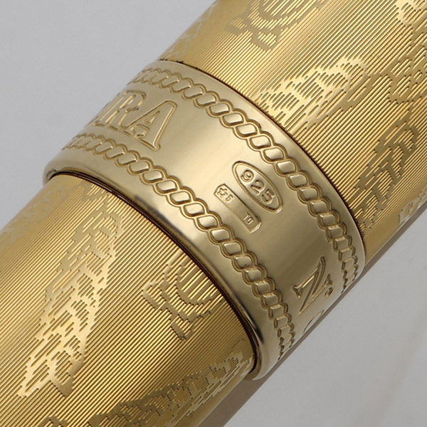 Color Vermeil - gold plating over sterling silver. According to the accompanying literature: "barrel, cap, chiseled rings and head" are all vermeil.