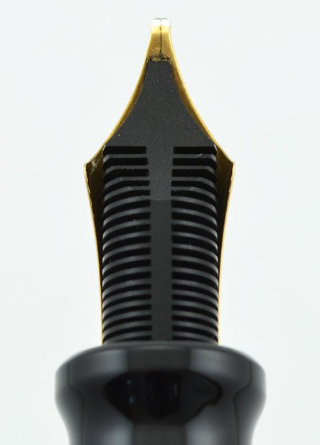 Nib Broad 18k nib. The nib and feed don't have a label but the nib has a wide tip. It writes like a fairly wet broad. The nib is quite springy.