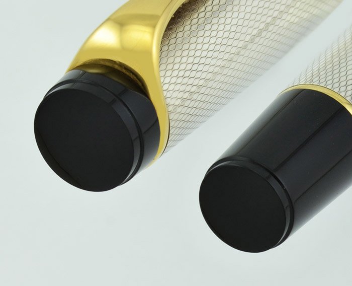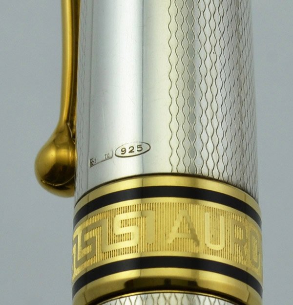 Color Sterling silver cap and body with gold plated trim. The sterling has a guilloche, or barleycorn, pattern. The section is black.