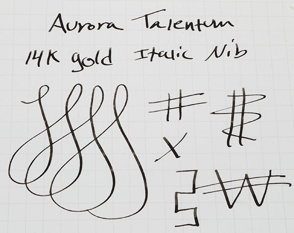 Nib 14k ITALIC FINE nib. It is rhodium plated to match the rest of the pen's trim. The fine italic nib gives just enough line variation to see it in your handwriting, while still putting down a fairly thin line if you have smaller handwriting. See writing sample below.