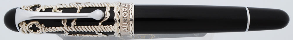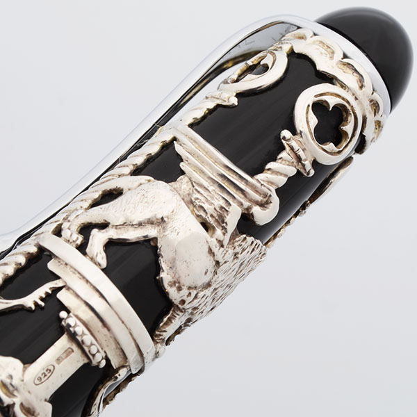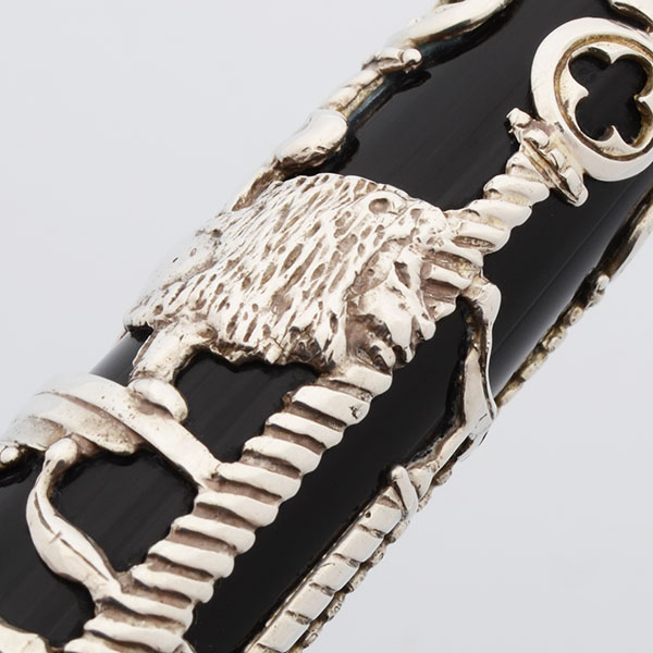 Color Black resin, with elaborately detailed sterling silver artwork overlaid on the cap. The trim is silver-colored.