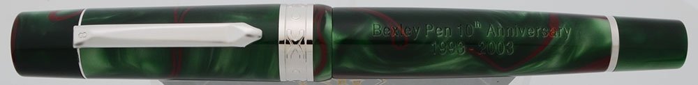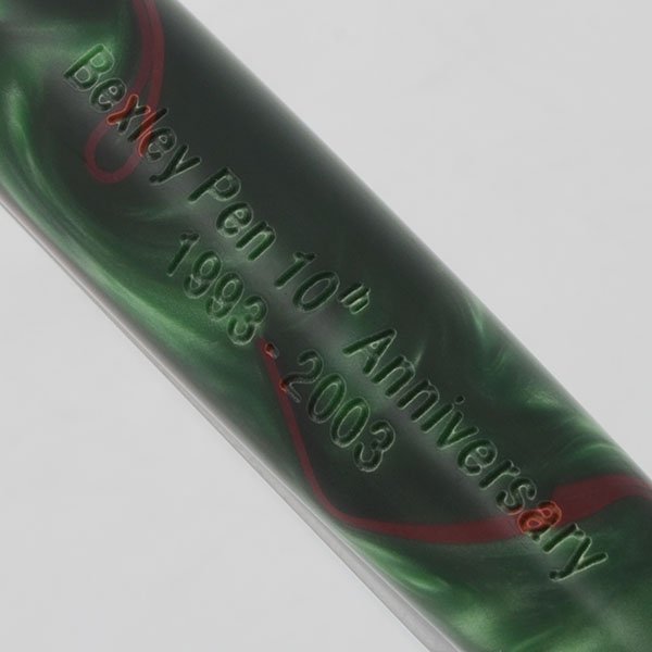 Color This pen is made of green swirl acrylic with red snaking lines and with chrome trim. Since it is a 10th anniversary pen, the cap band has X's on it for the Roman Numeral 10.
