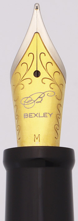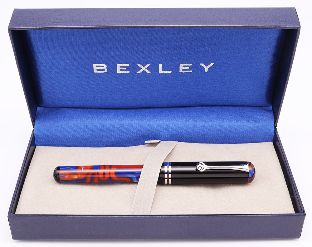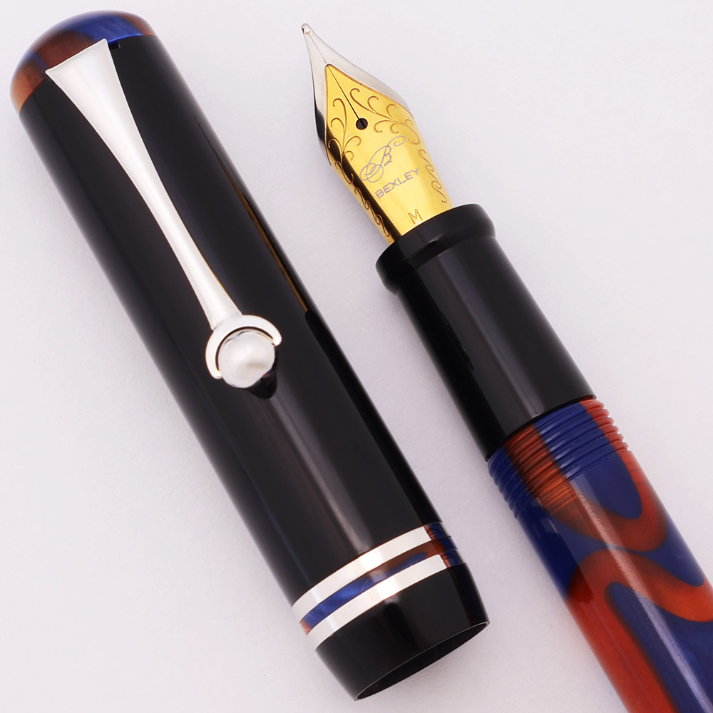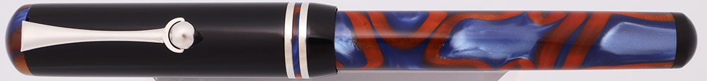 Color "Ashland, Ohio" has a blue with brown swirl barrel that has luminescence. The cap is black with a band of the barrel color between two chrome cap bands and a barrel color cap finial. The cap has chrome trim.