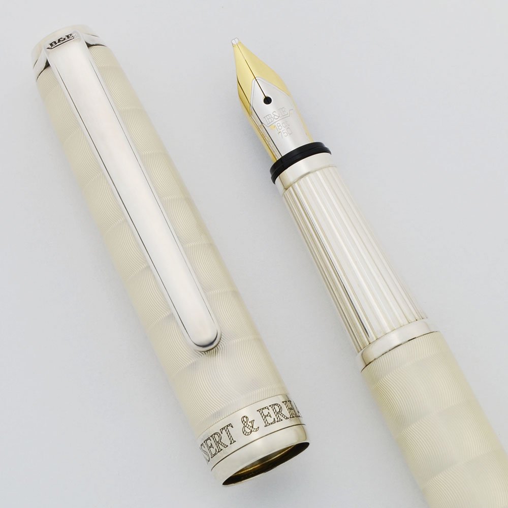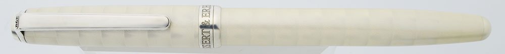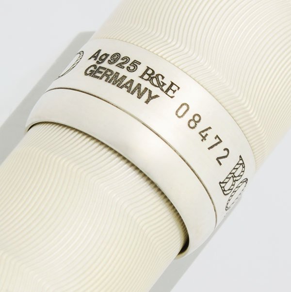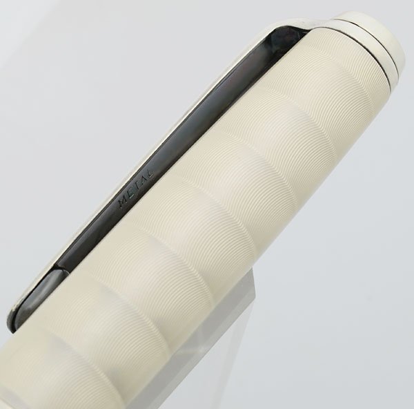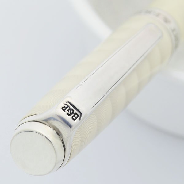 Color Pearl White cap and barrel with guilloche design and sterling silver trim. Beautiful lined sterling silver section. The cap band is marked AG 925 with serial number 08472.
