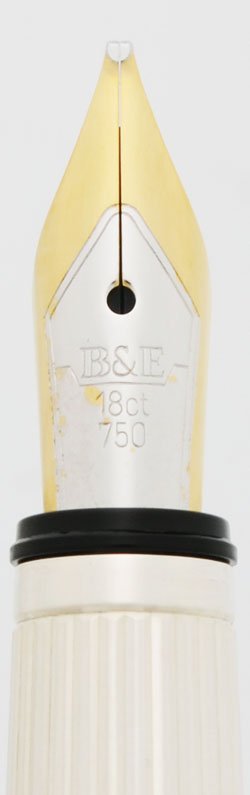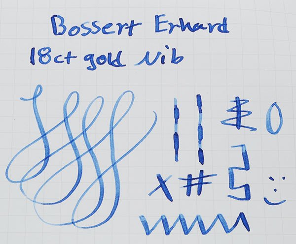 Nib Broad 18k nib. The box and tag in the box indicate Broad nib. The tines spread easily and far enough that some line variation can be noted (see writing sample).