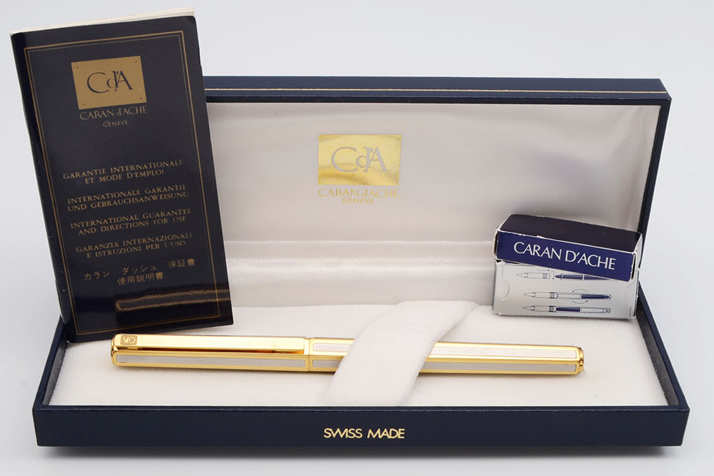 Condition Excellent condition in box. No dents, dings, or plating wear. The gold surfaces have light scratching and polishing marks, but still reflect a lot of light in hand. The section has some handwear, and the gold trim ring near the front of the section has plating wear. The pen is working very well and ships in the original Caran D'ache box, with booklet and two small boxes of cartridges.