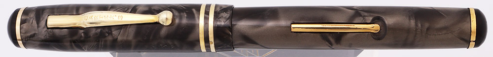 Condition Excellent condition with no cracks, chips, dents, or dings. This is a nice-sized, shiny pen with a beautiful pearlescent grey pearl surface pattern and black rounded end pieces. The cap and barrel have light to moderate wear and microscratching. The cap bands have microscratching and a bit of brassing. The clip has scratches and some brassing along the edges, and plating wear on the ball end. The top gold band looks good. The top black piece has a small scuff. The band at the end of the barrel has plating wear along the edges and one splotch that connects the top and bottom. The black end piece has moderate scratching. The imprint on the clip is clear.