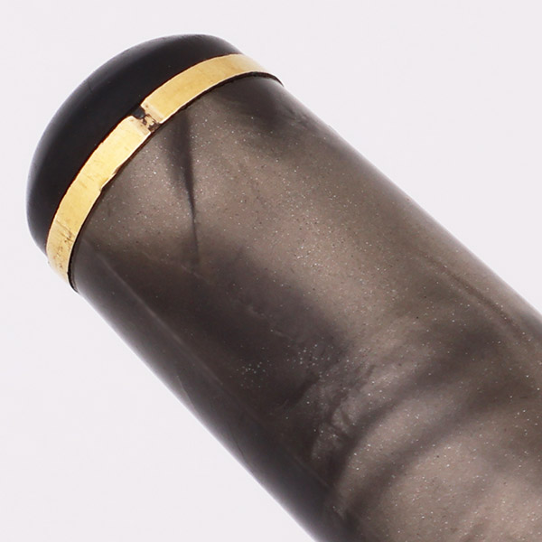 Color Grey Pearl (with beautiful pearlization) celluloid with gold trim. The cap has two thin cap bands and there are gold bands just below the black cap and barrel end pieces.