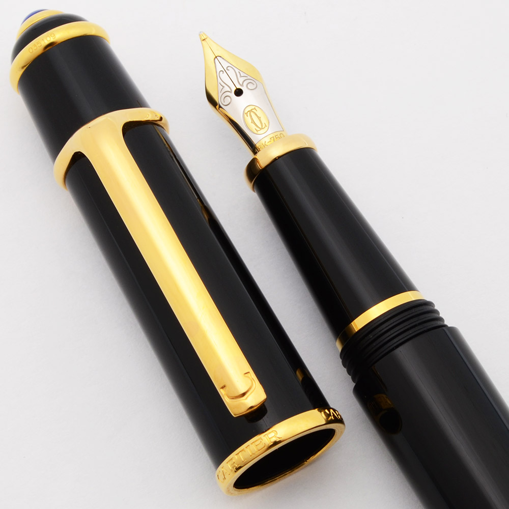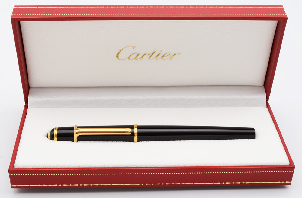 Condition Near Mint in Box. The pen has been dipped, but has never been inked. Gorgeous condition. We could not find any scratches or chips. Comes in red Cartier box in pristine condition, which is housed in an outer cardboard box. Also included is a small folio which includes certificates, and a box of short international cartridges.