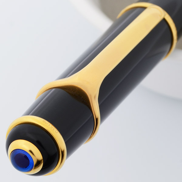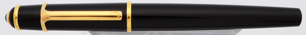 Color Black composite with gold plated trim. "Composite" means a combination of resin and plastic. The top of the cap has a blue cabochon.