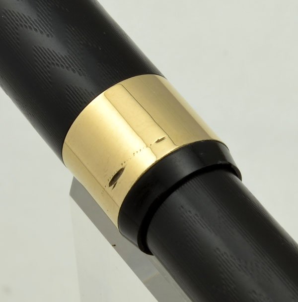| Color | Black chased hard rubber with gold plated trim. The chasing pattern on the cap and barrel is well defined and dark with light wear. The hole is heart shaped, but you'll notice that the Conklin nib department did not cut the slit to perfectly align with the heart shape, but it makes little difference in the way the pen writes. |