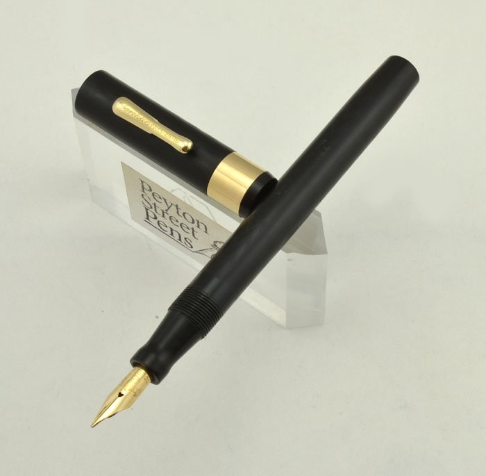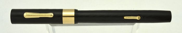 Restored and ready to write. No cracks or chips, no brassing. There is a gouge in the cap band, as though the trim was tested for gold. The pen is nice and dark, though the chasing is a little worn. |