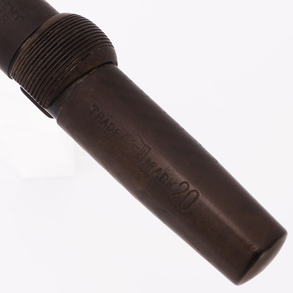 Condition Excellent condition with no cracks, chips, dents, or dings. This is a classic crescent filler fountain pen with excellent intact chasing. The barrel and section of the pen has faded to a deep olive color; the cap is still dark and black. The chasing on the barrel is smoothed down, but still visible. The barrel has faint marks caused by the cap lip and some light scratching. The crescent looks excellent with some small spots of plating wear along the top edge. The cap looks excellent, with strong chasing and a deep color. The clip is straight with some small touches of brassing. All imprints are clear.