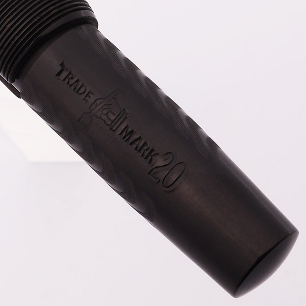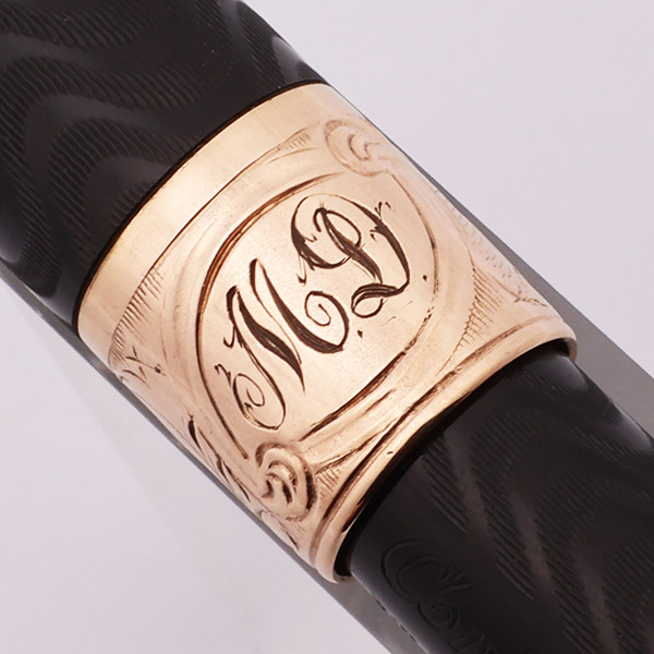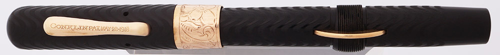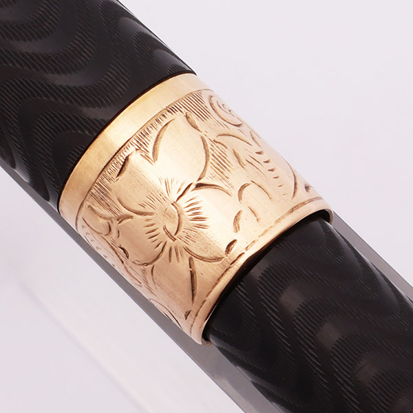 Color Black chased hard rubber with gold plated clip and crescent. 1/2" wide cap band, engraved with a floral pattern.
