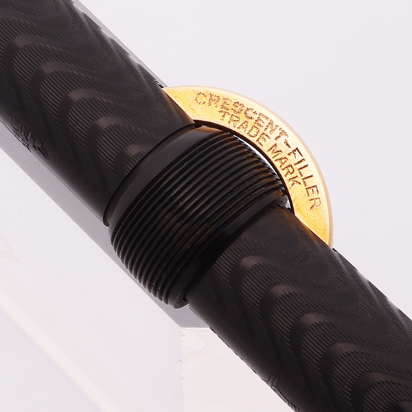 Condition Superior condition. The coloration is strong and even, with very little fading. The chasing pattern on both cap and barrel is crisp and clear, and almost looks new. The trim and imprints look great. The cap band is personalized with the initials "M D". The details in the crescent and on the clip are intact. There are some tiny dents on the grooves of the band that rotates within the crescent. The clip is straight and firmly in place, with no obvious brassing. No cracks or chips, dings or dents. The imprints are mostly crisp and clear, with just a slight bit of smoothing in the word "crescent" on the barrel. It's fully restored and working well.