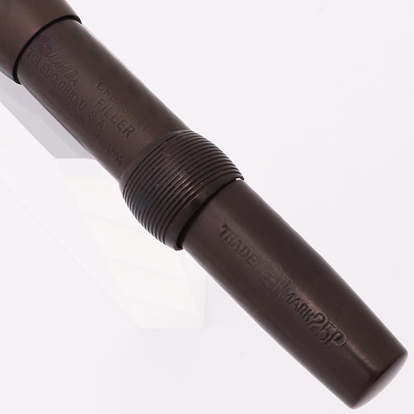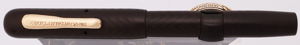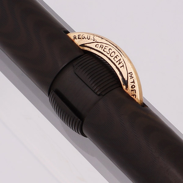 Condition Excellent condition with no cracks, chips, dents, or dings. This is a very small crescent filling pen made of black chased rubber and with pretty gold trim. The chasing is slightly worn but all visible. The color has faded to a deep chocolate brown as contrasted to the dark black under the cap. The cap and barrel look nice with just some light microscratching. The crescent is nice and gold and the imprinting on it is crisp. The clip has moderate scratching near the top and along the sides. The barrel imprint is clear.