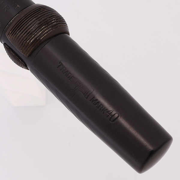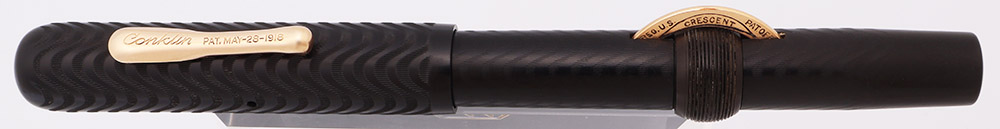 Condition Excellent + condition with no cracks, chips, dents, or dings. This is a large, impressive pen that has retained its deep, dark color. The chasing on the cap is perfect; the barrel chasing pattern is slightly worn down but still quite clear. Very slight marks on the barrel from capping. The imprint is faded, but still readable. the lock ring has faded to a dark olive color. The crescent has some brassing along the top of the hump. The clip looks beautiful. The imprints are clear.