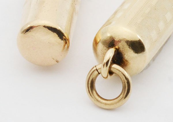Color Gold filled overlay over black hard rubber. The overlay has a checkerboard, or filled in alternating squares, pattern.