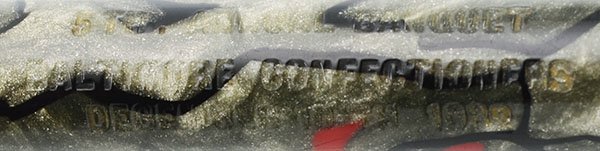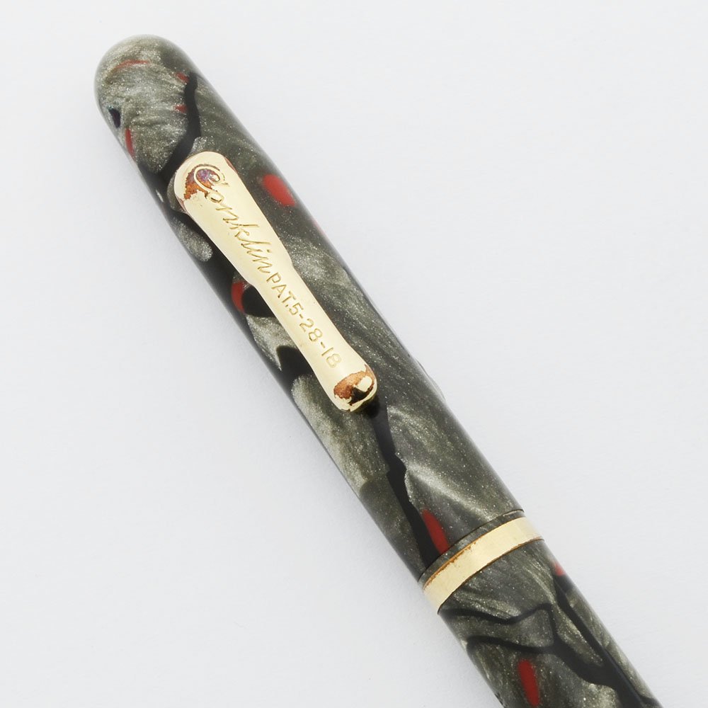 Color Stone washed gray with black veins and red flecks. The trim is gold plated. It has the classic Conklin clip and a band between the cap and barrel. There is a dotted pattern on the cone.