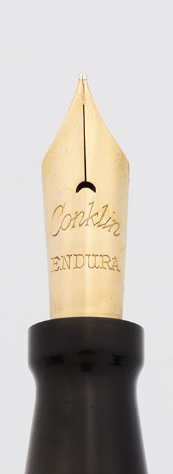 Nib FINE Gold nib marked Conklin Endura, with crescent-shaped breather hole. Firm and smooth.