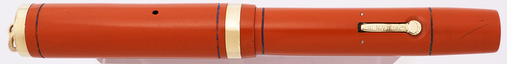 Condition Very nice condition overall. This is a brightly colored, shiny, classic looking little ring top pen. The has light to moderate scratching. There are some long, deep scratch lines, three noticeable ones near the end and one to the right of the lever. The tiny lever has light microscratching and a tad of plating wear along the edge of the end disc. The cap has light to moderate microscratching, but no cracks. The cap band has light microscratching with a slim line of plating wear on the lower edge. The top ringtop base is banged up with little dents all around the edges. The ringtop hardware looks great. The imprints are clear.