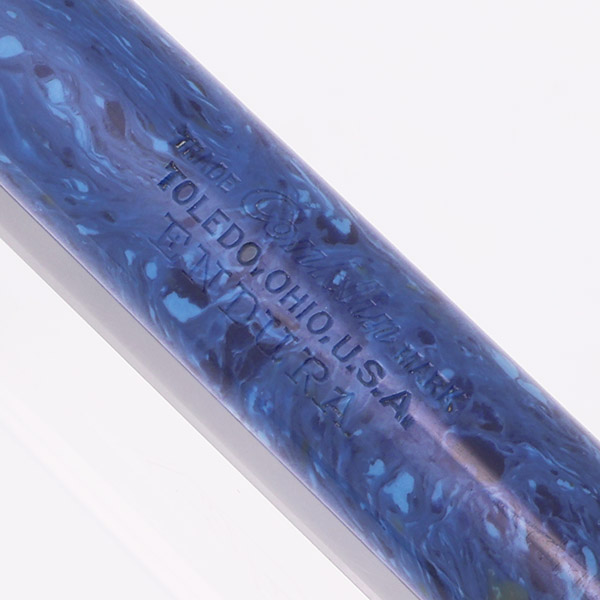 Color Blue marbled celluloid. There are some lines engraved around the fountain pen barrel, and in these grooves the original red color remains.