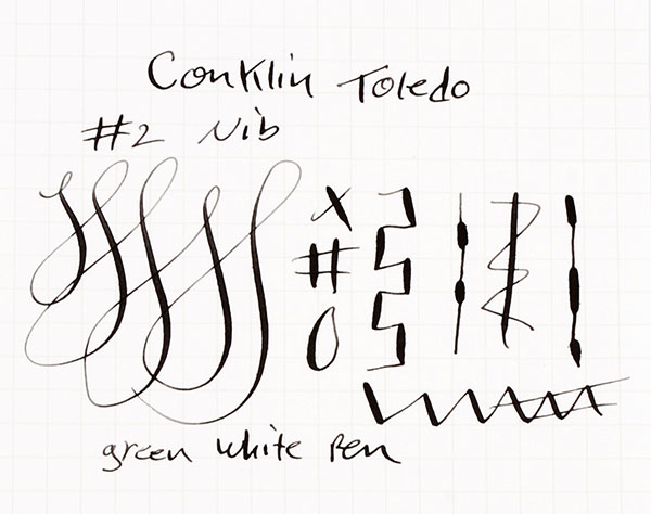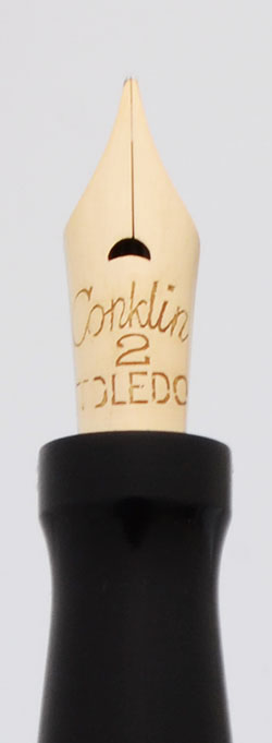 Nib FLEXIBLE FINE gold #2 Conklin Toledo nib is smooth with nice tipping. Nice line variation from fine to broad. See our writing sample below.