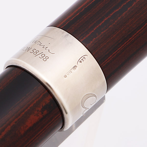 Condition Excellent + condition, in box, with no cracks, chips, dents, or dings. This is a beautifully colored, shiny limited edition (#58/98). The cap and barrel have light scratching only. The wide sterling silver cap band and clip have moderate microscratching. The crescent filler looks nice with just some light polishing marks. The imprints are clear.