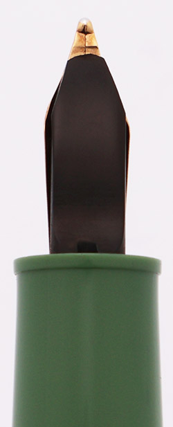 Condition Excellent condition with no cracks. This is a classic fountain pen that is shiny and with a delightful color. The barrel has marks caused by the cap lip and with light to some moderate scratchiing. The cap has moderate scratching. The top jewel has some deep marks around the edge. The cap band has lots of microscratching. The clip and clip ring have brassing, microscratching, and some plating wear. The imprint is slightly faded but legible.