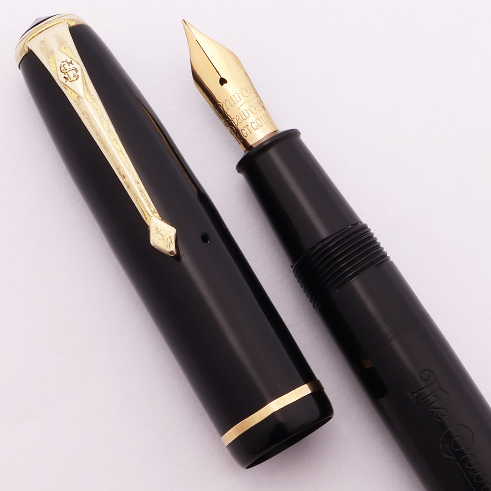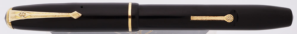 Condition Excellent condition with no cracks, chips, dents, or dings. This is a nice-sized pen in a classic color and in a classic design. The barrel has marks caused by the cap lip and moderate wear, especially near the end. The cap has moderate wear. The lever has pitting along the edges but the gold is still intact on the face. The cap band looks great. The clip and clip band have brassing and there is a bit of plating wear along edges. The top cap jewel has the paint scratched off at the very top. The imprints are clear.