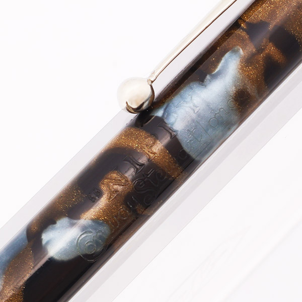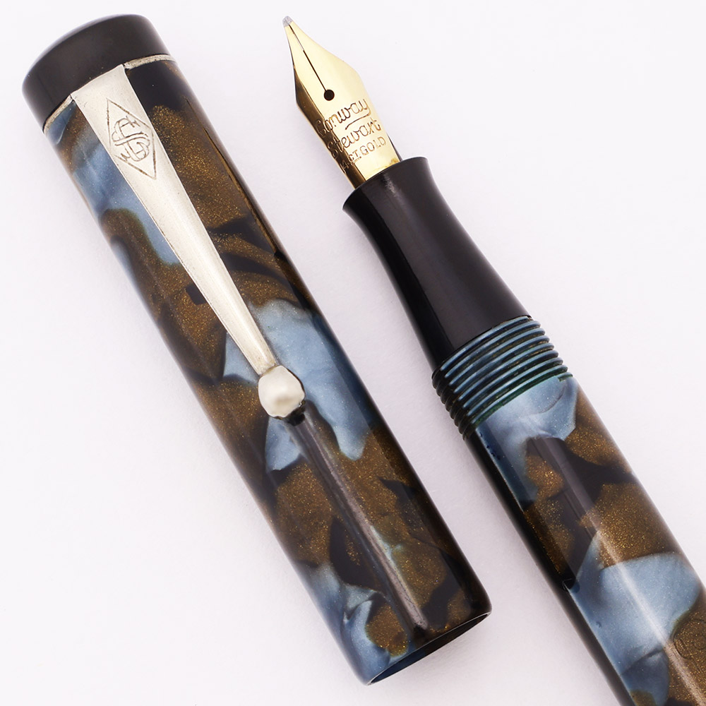 Color Blue and Brown marble (the blue has pearlescence). Two straight black lines running the length of the barrels. Black end pieces on the fountain pen. Black 5/8" end piece on the barrel and black section beneath the short gold cone on the mechanical pencil. Chrome trim, though it may have originally been lightly plated with gold.