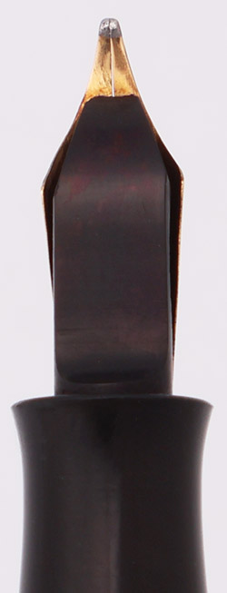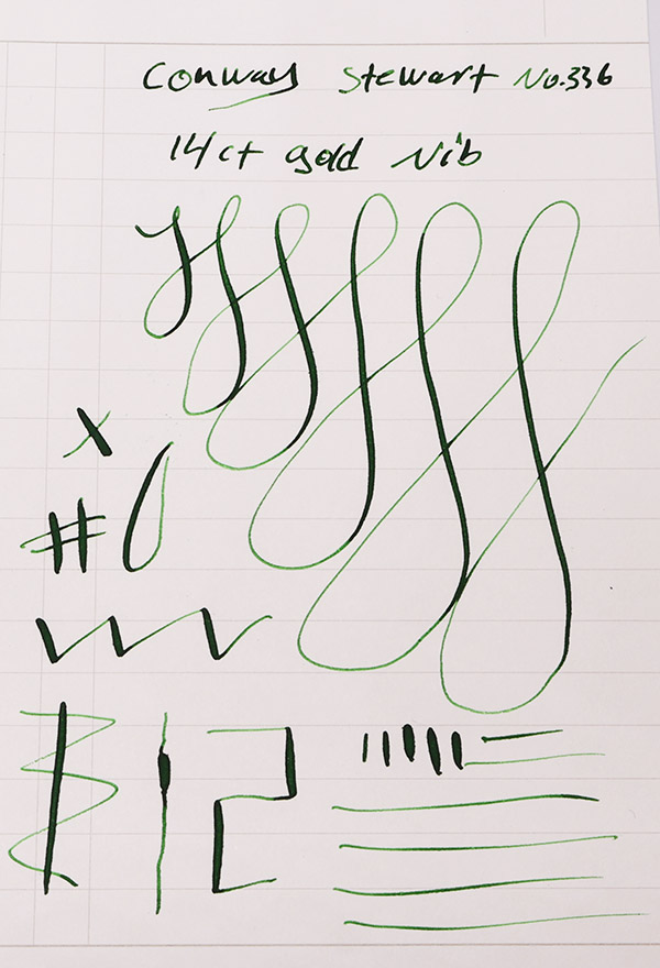 Nib FINE-MEDIUM FLEXIBLE 14k nib. Please see writing sample. Modest line variation from extra fine to medium, with a slight oblique cut.