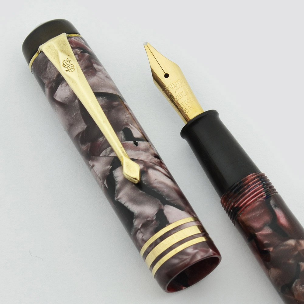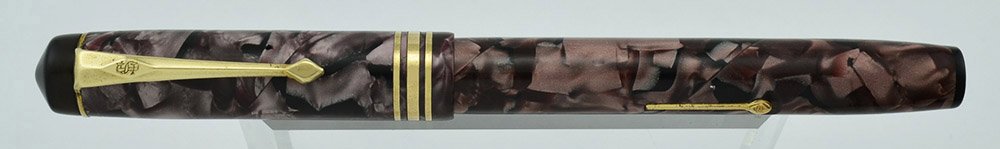 Color Burgundy and black marble pattern. The color is a little faded so it's a nice creamy red brown. It has three cap bands and a black domed end piece above the clip and a matching black flat end piece on the barrel. It has gold plated trim.