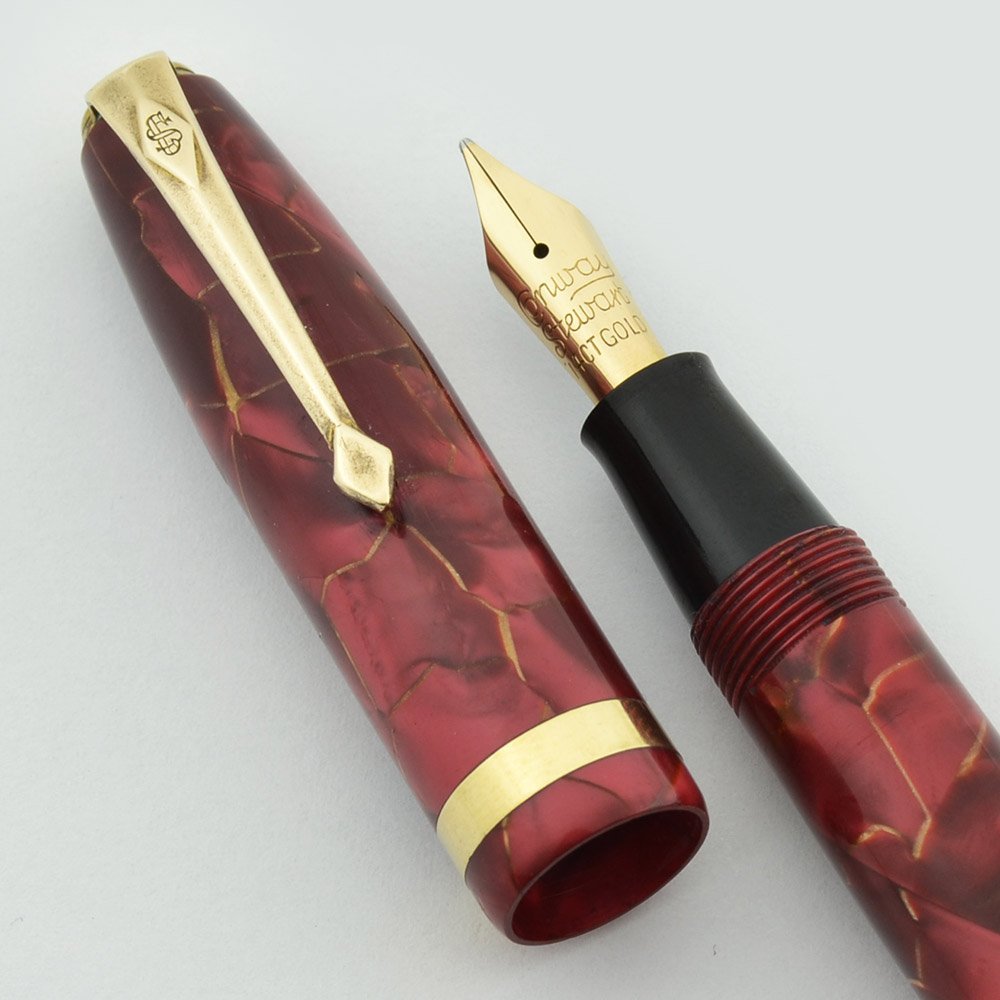 Condition Excellent condition. There's some fine flecks of pitting on the trim. It's marginal but consistent on the clip, tassie, and lever. There is also plating wear on the end of the clip, particularly on the sides. The cap jewel looks good. There's some handwear on the pen. It's a beautiful pen, in one of Conway Stewart's nicest colors, working very well.