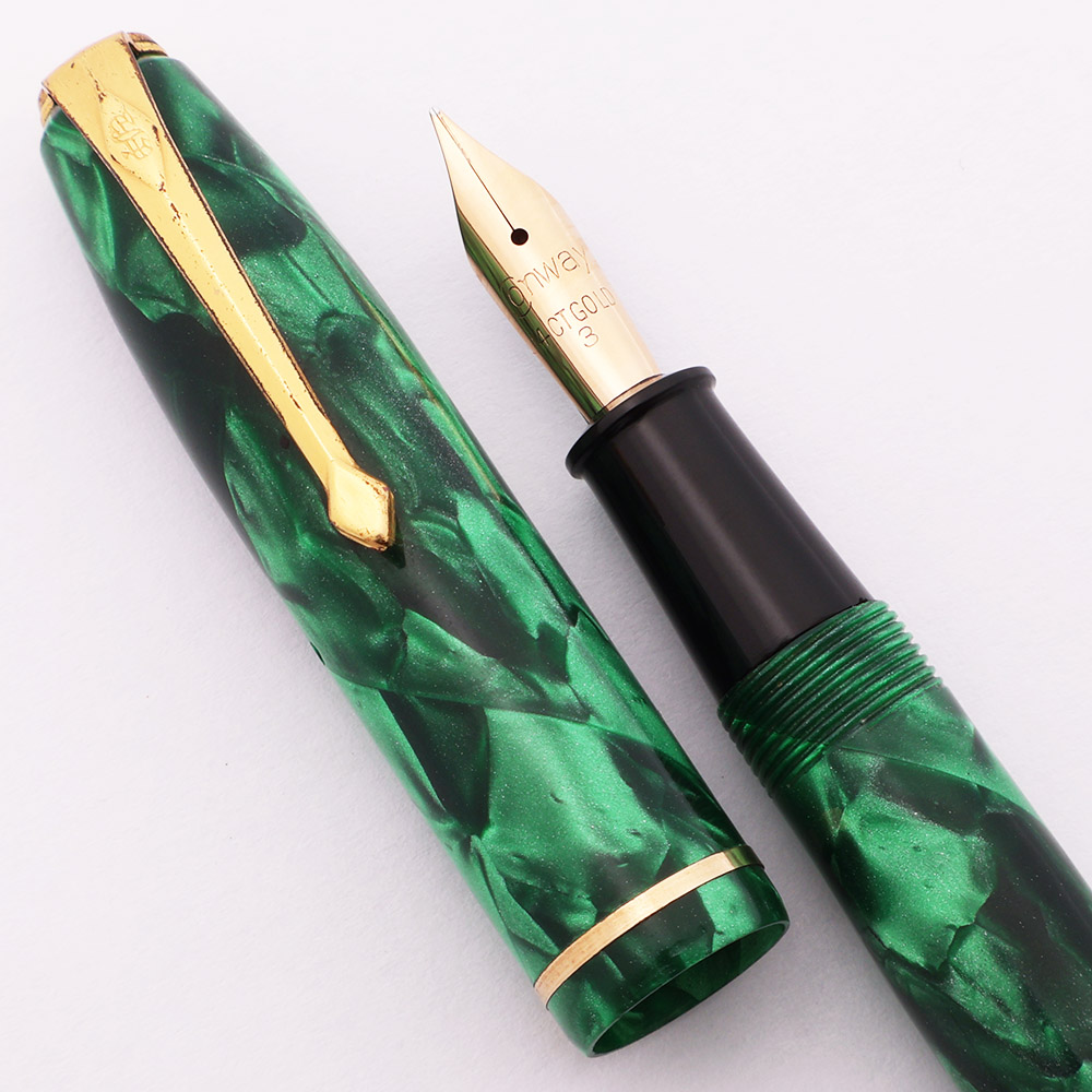 Condition Excellent condition with no cracks, chips, dents, or dings. These is a brightly colored pen with some pearlescence in a classic design. The color is consistent and brilliant. The barrel has light marks caused by the cap lip and light scratching. The lever is excellent. The cap has some small, indented marks below the cap band. It otherwise has light scratching, similar to the barrel. The cap band has light plating wear along the edges and microscratches. The clip and top gold jewel piece have plating wear on the edges and some light pitting. The imprints are clear.