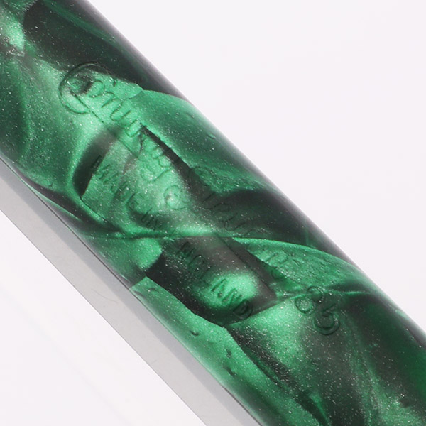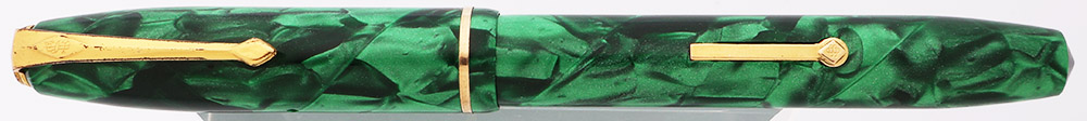 Color Bright green marble. Black section and barrel end jewel. Thin cap band and diamond clip. Gold plated trim.