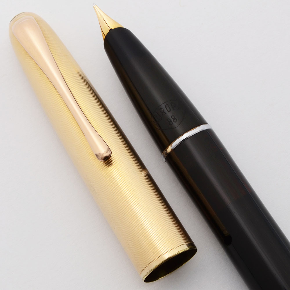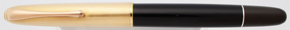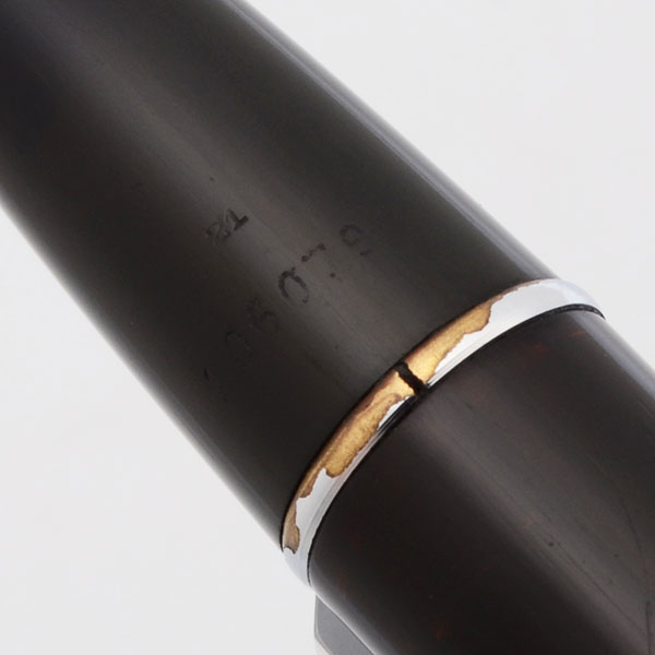 Condition Very nice condition. The barrel and section are dark and shiny, though the piston cap has faded a bit to dark brown. The clutch ring is split with a gap of about one milimeter, but stays in place and does its job to hold the cap on. The clutch ring also has a fair bit of brassing. The cap has some small dents, and a scrape near the top. There is also some brassing, especially on the cap lip. The clip has brassing and light plating wear on the the sides, as well as around the open end. The ink viewing window is clear. Overall the cap looks pretty good in hand. The section imprints are easy to read.