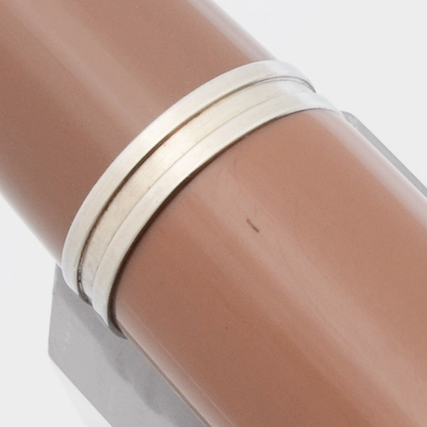 Condition Excellent + condition, in box, with some minor wear. The fountain pen has some capping marks on the hood, and faint posting marks at the end of the barrel. The rest of the pen's body looks great, no other scratches. The cap looks great, with some light scratching and small shiny marks. The clip has tiny touches of brassing near the arrow, but none along the edges. The jewel has some tiny dents. The pencil looks great, with light scratching. The tassie has some dots of pitting around the jewel. The jewel looks great, no discoloration or dents and scratces. The cocoa color looks perfect on both pieces. The box is also in great condition, though the platform is lifting up a bit.