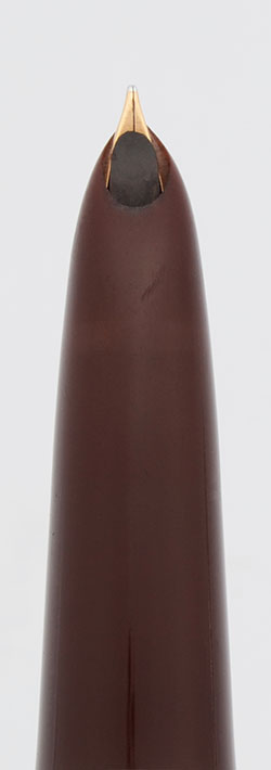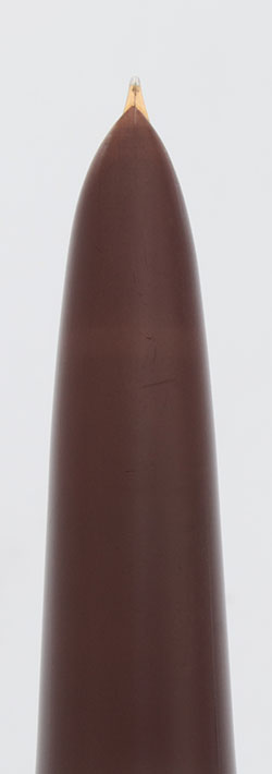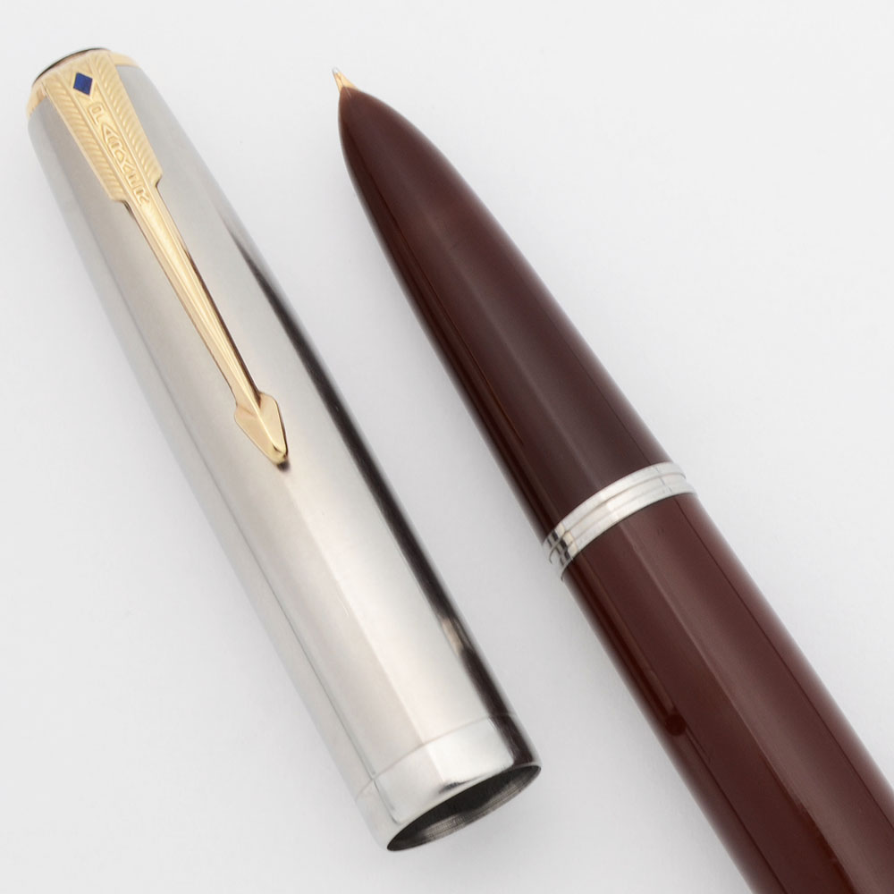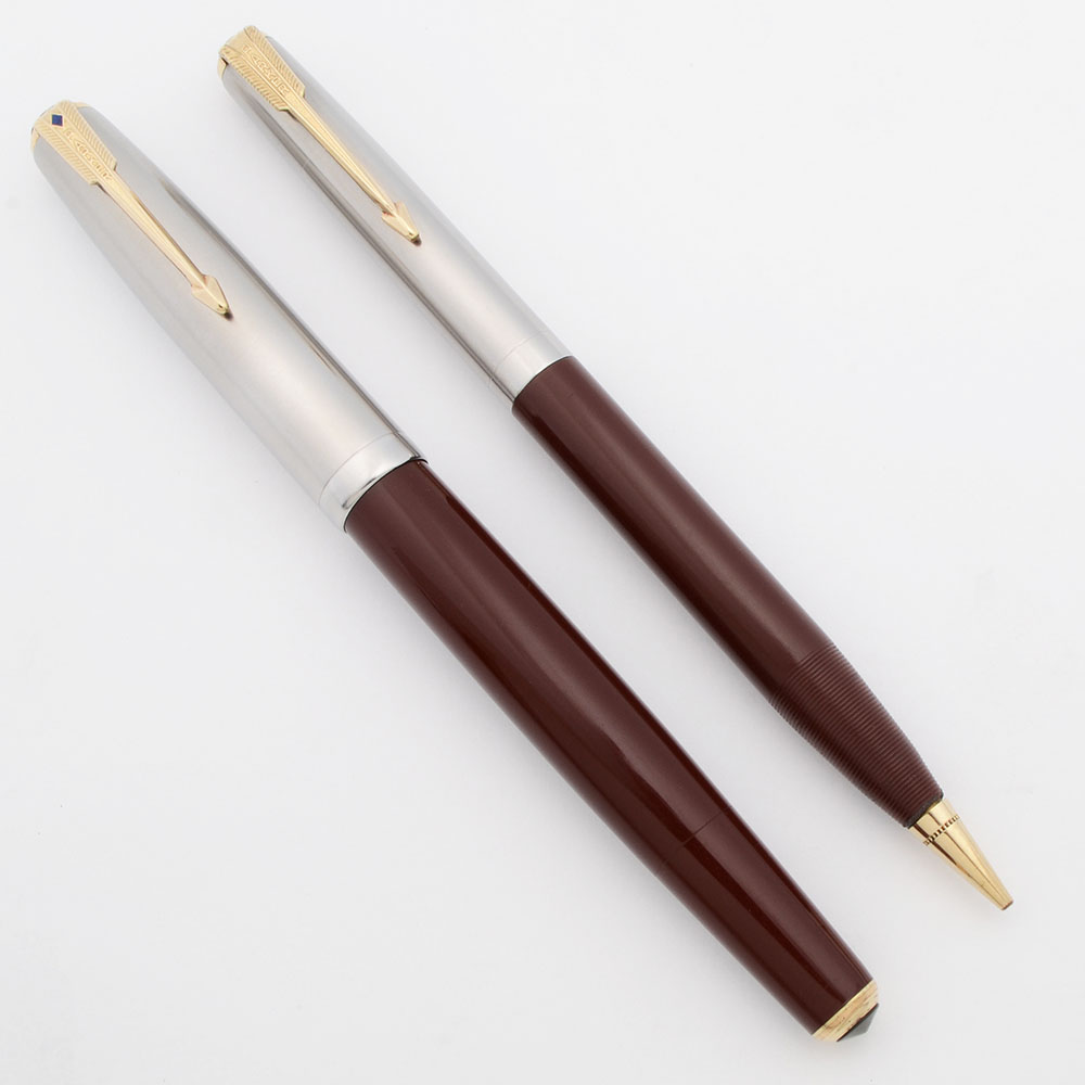 Color Cordovan brown bodies. Lustraloy caps with gold-filled clips. Blue Diamond clip. Pearlescent jewels.