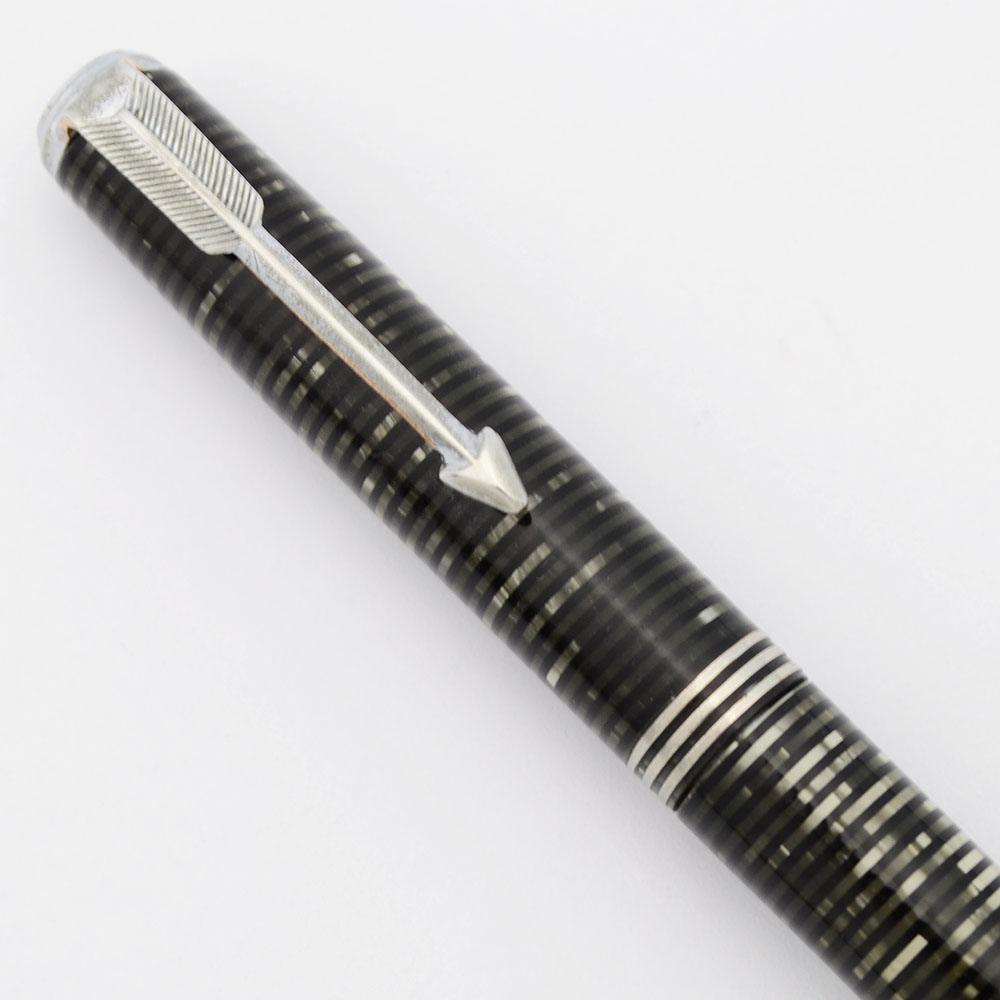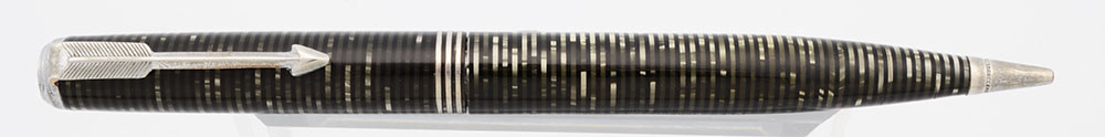 Color Silver Pearl body, cap, and cap jewel. Chrome or nickel plated trim with triple thin cap bands and the Art Deco Arrow clip.