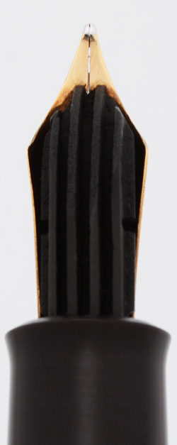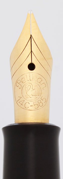 Nib FINE 14C 585 nib. It is firm and smooth. The nib was likely replaced at some point, because the piston knob is stamped OF for "oblique fine", whereas the nib is imprinted only with F.